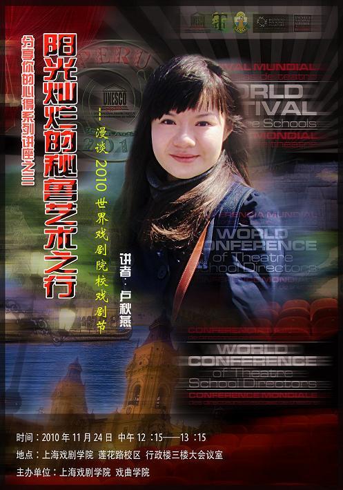 今年八月,我校戏曲导演专业青年教师卢秋燕带领学生参加了由联合国教科文组织国际剧协在秘鲁举办的“2010年世界戏剧院校戏剧节”。在本次讲座中她将向大家介绍戏曲导演专业在戏剧节中的演出及工作坊的盛况,和大家分享来自世界其他26所戏剧院校中的精品演出,和大家聊聊秘鲁传统舞蹈大师班的学习心得,带领大家感受来自南美的古印加文明的魅力……(供稿/刘聪 编辑/戎戎)
