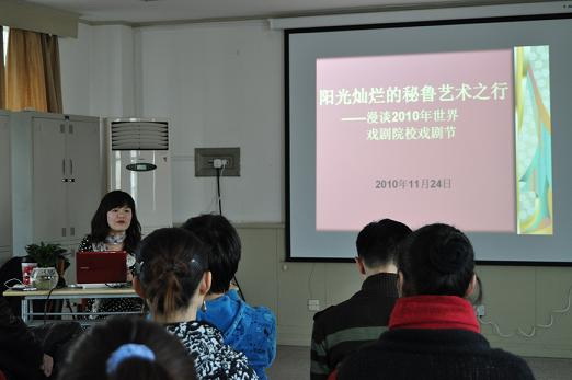 11月24日中午12:15在莲花路校区行政楼举办了“分享你的心得”系列讲座之三—— “阳光灿烂的秘鲁艺术之行”。此次讲座由我校戏曲导演专业青年教师卢秋燕跟大家分享了关于今年暑假她和戏曲导演专业学生赴秘鲁参加“2010年世界戏剧院校戏剧节”的心得体会。