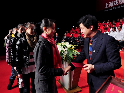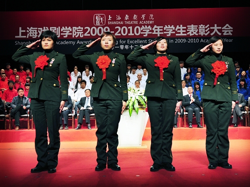 获得世博优秀奖、见义勇为奖、助人为乐奖,国家、上海、校级奖学金奖等奖项的同学以及获得各类先进集体的学生代表先后上台领奖。其中刚刚圆满完成世博安保任务,光荣退伍返校的周冰玫等五名同学荣获“上海戏剧学院特殊荣誉奖”,党委书记楼巍为她们颁奖,并赠发校服。随后,表演系刘洋、研究生部章�、世博女兵团队分别上台发言,与同学们分享成长的收获,也表达了对