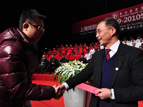 12月16日下午,上海戏剧学院2009—2010学年学生表彰大会在上戏剧院隆重举行,党委书记楼巍、院长韩生、副院长孙惠柱、副院长宫宝荣、校务委员会副主任葛朗、院长助理王宏舟等领导和老师出席大会并在主席台就座。表彰大会由王宏舟老师主持。