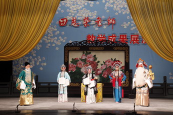 演出间隙,李长春、钳韵宏、孙毓敏、舒桐等嘉宾分别作了简短的发言,他们对田老师的师德师风,教学成果,对本次展演的深远意义给予了充分肯定。他们表示:“田恩荣老师教学成果展演”的隆重举办,不仅对京剧花脸艺术的正确传承、发扬京剧花脸艺术的优秀传统、真正吸取净行传统的精华产生现实的有益作用,而且对展现京剧名师风采、吁请社会各界关注戏曲教育富有积极意义。著名戏曲理论家王家熙先生在为展演撰写的序言中用深情的笔墨写道:学生的成功在于田老师的精心传授,使之领悟到了“裘”派的精神实质,学生汲取的是真“裘”派的精华。回顾田老师半个世纪以来迷戏、爱戏、痴戏、教戏的心路历程,他确实不负“裘”派艺术,不负戏曲学校,更不负热爱戏曲的孩子们。田老师自幼酷爱京剧艺术,五十年来不断深入学习、钻研、探索,视京剧艺术为生命,他深得京剧净行表演,特别是“裘”派唱腔艺术精髓。他执教后,以满腔心血投入京剧人才培养的工作,几十年如一日,早出晚归,辛勤耕耘,无私奉献,兢兢业业,一丝不苟。经他的精心传授,一批又一批花脸新秀崭露头角,在舞台上竞放光彩。他在担任京剧教研组组长及京剧科科长期间,团结全体教师,身正为范、因材施教,京剧专业人才辈出。京剧专业也成为上海市的重点专业。田老师作为学科带头人,为学科的建设和发展,精心谋划、殚精竭虑,发挥了无可替代的作用。在走上分管教学的副校长岗位后,他紧抓教师队伍建设,重视基础教学,提出“夯实基础,严谨治学,高效管理,规范传承”的办学理念,并深入教学第一线,抓教学质量、教学进度、教学与演出实践的结合及教学研讨活动,使全校各专业教学规范有序,出人出戏,取得可喜成果。在教学管理的同时,田老师不断总结教学经验,撰写学术论文,多次赴美国、香港、澳门举办讲座,介绍京剧艺术,深获好评。展演结束后,田老师在热烈的掌声中走上舞台与观众见面,谈到授业恩师的教诲,田老师黯然落泪,他尊师重道的精神在此可见一斑;对于嘉宾们的褒奖,他谦逊有加,他说:“今天举办我的教学成果展演,不仅是对我个人的褒奖,也是对学校全体老师教学成果的肯定。我将以此作为新的起点,加倍努力,不负众望,为培养更多更好的京剧‘裘’派表演人才,鞠躬尽瘁,奋斗一生。”朴实的话语透出他对京剧艺术,尤其是对“裘”派艺术学习、传承的一往情深。他的这种“蜡炬成灰”的精神值得每一位戏曲表演工作者、戏曲教育工作者学习。