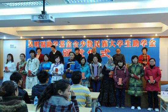 火恩杰会长将少数民族联合会赠予的礼品送到了雷先生手中,并充分肯定了吴明福助学基金会一直以来对少数民族教育文化事业作出的突出贡献,感谢对少数民族贫困学子的关心与资助。火会长表示,少数民族大学生是民族的未来,是民族的希望,帮助其顺利完成学业,成为一名对社会有用的人是在为民族发展事业和祖国的繁荣团结作出重大贡献,少数民族联合会将继续关注少数民族学生的衣食住行,为他们提供帮助。受助学生应以一份感激之情将爱心传递下去,为中华民族的繁荣与团结做出贡献。金梅主任表示对吴明福基金会感谢的同时,要同学们好好把握现在的机会努力学习,以优异的成绩回报社会,成为一名栋梁之才。雷传龄先生发表讲话说,要学生们感谢党的领导政策,感谢现在社会的良好环境为少数民族的发展创造了更多的机会,并希望学生们发扬光大助人自助的精神。