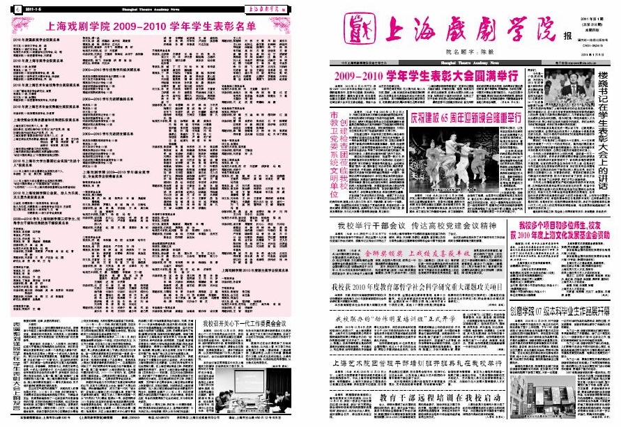 《上海戏剧学院报》2011年第1期(总第218期)已于2011年1月5日出版,本期共四版,一、四版套红。重点内容有:《2009-2010学年学生表彰大会圆满举行》、《庆祝建校65周年迎新晚会隆重举行》、《市教卫党委系统文明单位创建检查团莅临我校》、《我校多个项目和多位师生、校友获2010年度上海文化发展基金会资助》、《上海艺术院团管理干部培训班开班典礼在我校举行》等,敬请关注。也可点击下载观看。(图文/戎戎 编辑/戎戎)