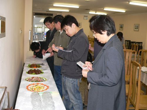 虽然大家都在轻松愉快的气氛下谈论着食堂的美食,准备着一会儿大饱口福,然而厨房里的师傅们都显得有些紧张和不自然。徐军老师说,他们每位都身怀绝活,却也为了这样的考评准备了三天,希望把自己最好的菜肴展现在大家眼前。而考评的标准也非常严格,分成色、香、味、型四大类,共一百分。徐军老师详细的介绍了考评的内容,色是事物的观感,即食物端上来给你的第一印象;香,顾名思义,当然是我们闻到的味道,以及食物原料的考察;味变是吃到嘴巴里滋味儿,是鲜是脆,还得你自己判断;而型,乃是食物刀工的技术,切的规格如何,是否好看,也证明这一个人的实力。