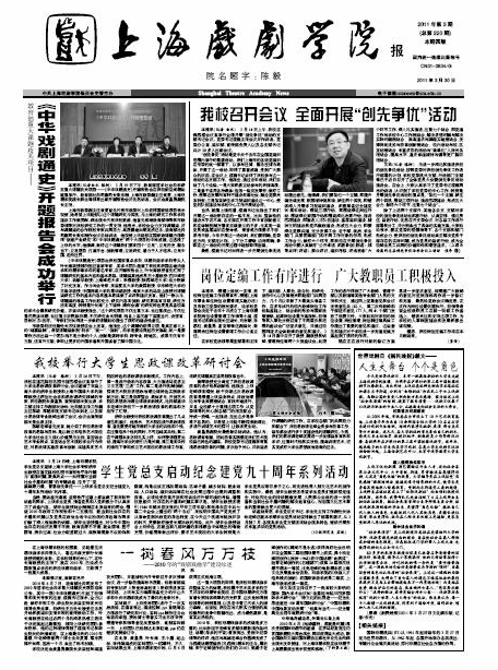 《上海戏剧学院报》2011年第3期(总第220期)已于2011年3月30日出版,本期共四版。重点内容有:《教育部重大课题攻关项目——<中华戏剧通史>开题报告会成功举行》、《我校召开会议 全面开展“创先争优”活动》、《岗位定编工作有序进行 广大教职员工积极投入》、《我校举行大学生思政课改革研讨会》等,敬请关注。也可点击下载观看。(图文、编辑/榕树)
