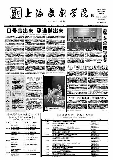《上海戏剧学院报》2011年第4期(总第221期)已于2011年4月20日出版,本期共四版。重点内容有:《口号亮出来,承诺做出来——我校召开“创先争优”活动工作交流推进会》、《我校召开党风廉政建设干部会议》、《我校荣获上海市第15届市级精神文明单位》、《我校召开申报市教委“085工程”项目推进会》等,敬请关注。也可点击下载观看。(图文、编辑/榕树)