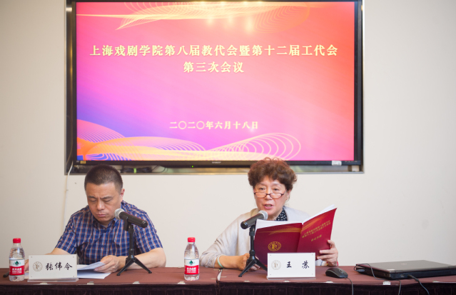 小组讨论结束后,大会继续进行,由王苏主持。大会表决通过了《2019年度学院行政工作报告》《2019年度工会工作报告》和《上海戏剧学院二级教代会制度》。校工会兼职副主席芦昂宣读大会决议。