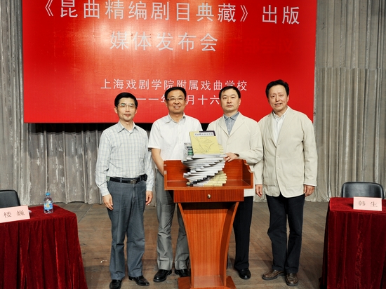 这套丛书前后耗时近六年,是上海戏剧学院教育高地整体规划中的组成部分,是继承和弘扬民族优秀文化遗产而进行的一项重大艺术工程。该套丛书共收集三百出剧目,每卷十五种,其结构框架分别为基础剧目、行当特色剧目、必学常演剧目和挖掘整理剧目;每出剧目附有“作者简介”、“剧情提要”、“艺术特色”、“人物穿戴砌末”、“剧本正文”、“注释”、“曲谱”等内容;具有系统性、示范性、实用性等特点。既适合演出团体、艺术院校、曲社等作为专业教材,也适合作为个人爱好者的阅读、欣赏和研究。上海戏剧学院叶长海教授专门为本书写了序言,他评论该书为“历代昆曲演出剧目的精品集成,称得上是新世纪的《缀白裘》”。今年五月,又恰逢联合国教科文组织授予昆曲为“人类口头和非物质遗产代表作”十周年纪念,大家在充分肯定这套丛书的价值和意义的同时,也希望以此为契机,进一步普及和发展昆曲的受众面。