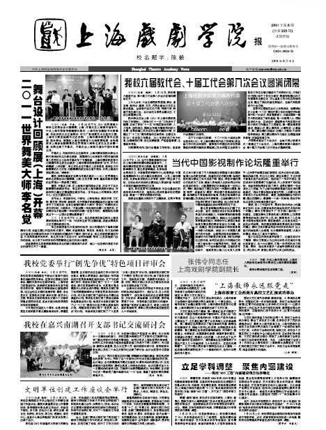 《上海戏剧学院报》2011年第6期(总第223期)已于2011年6月1日出版,本期共四版。重点内容有:《2011世界舞美大师李名觉舞台设计回顾展(上海)开幕》、《我校六届教代会、十届工代会第八次会议圆满闭幕》、《当代中国影视制作论坛隆重举行》、《张伟令同志任上海戏剧学院副院长》、《我校党委举行“创先争优”特色项目评审会》等,敬请关注。也可点击下载观看。(图文、编辑/榕树)