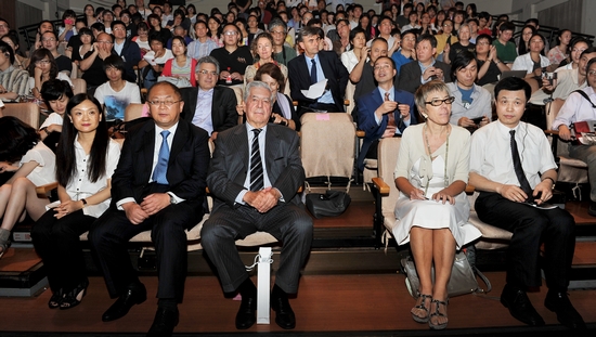 6月14日下午,2010年诺贝尔文学奖获得者、著名作家巴尔加斯•略萨来我校访问。我校院长韩生,副院长孙惠柱、黄昌勇、宫宝荣参加了接待,并在余秋雨大师工作室进行了交谈。随后,略萨在新空间与我校师生以及中国著名作家叶兆言、孙甘露进行了一次现场对话。西班牙驻上海领事馆文化参赞伊格纳西奥•莫罗、秘鲁驻华大使哈罗德•弗西斯等外方代表也出席了此次活动。