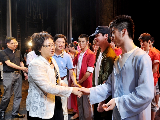 图为陈东同志与演员亲切握手