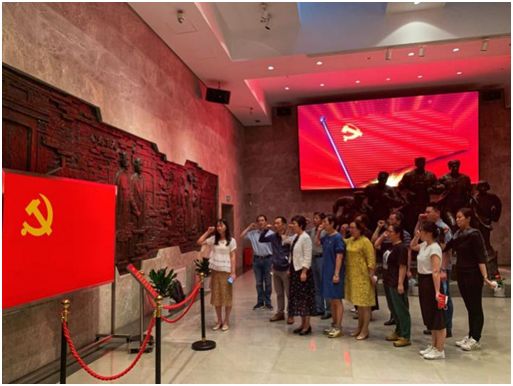 在纪念馆序厅,面对鲜红的党旗,大家重温入党誓词。有党员说:“每次对着党旗宣誓,都是心潮澎湃,激情满怀,更加坚定地牢记入党时的庄严承诺和初心使命”。