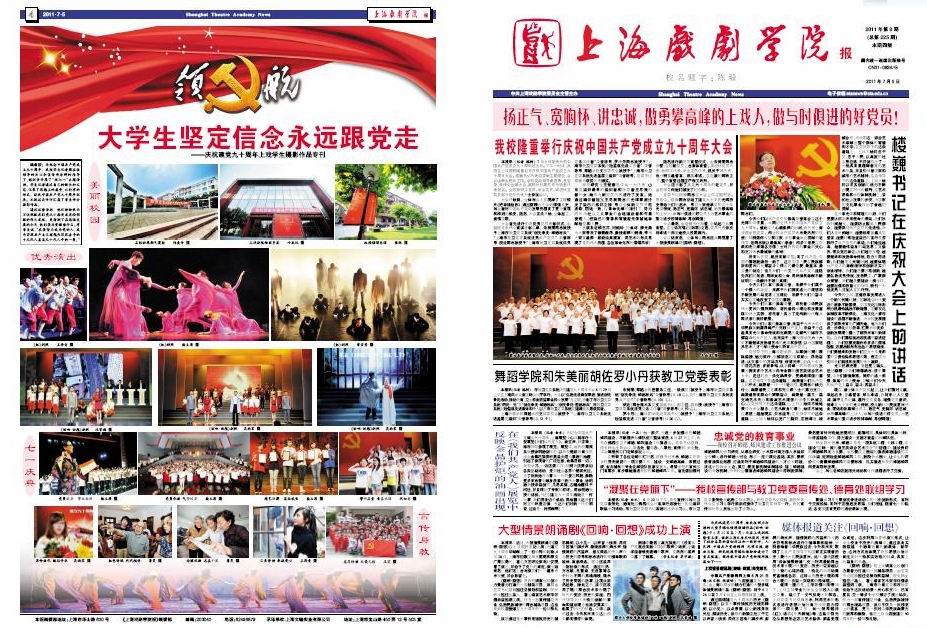 《上海戏剧学院报》2011年第8期(总第225期)已于2011年7月5日出版,本期彩版,共四版。重点内容有:《我校隆重举行庆祝中国共产党成立九十周年大会》、《楼巍书记在庆祝大会上的讲话》、《舞蹈学院和朱美丽胡佐罗小丹获教卫党委表彰》等,敬请关注。也可点击下载观看。(图文、编辑/榕树)
