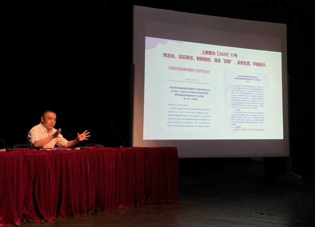 最后张伟令副书记总结会议精神,要求全校各二级院系要有高度的政治站位,切实行动起来,把开学各项任务具体落实到岗、细化到人,确保做到三个加强:学生日常管理规范化;学生宿舍管理精准化;学生爱国卫生健康教育常态化。他提出“常态防控、动态运行,信息通畅、快速反应,应急演练,联防联控;科学精准、追求实效;人人尽责、共情关爱”四十字要求。同时要求全体班主任和辅导员需要及时关注学生的思想动态,结合上戏自身特点把生命科学、健康教育、疫情防控等作为重点内容融入“开学第一课”,共情关爱彰显上戏温度。(文:薛嘉 图:张译月)