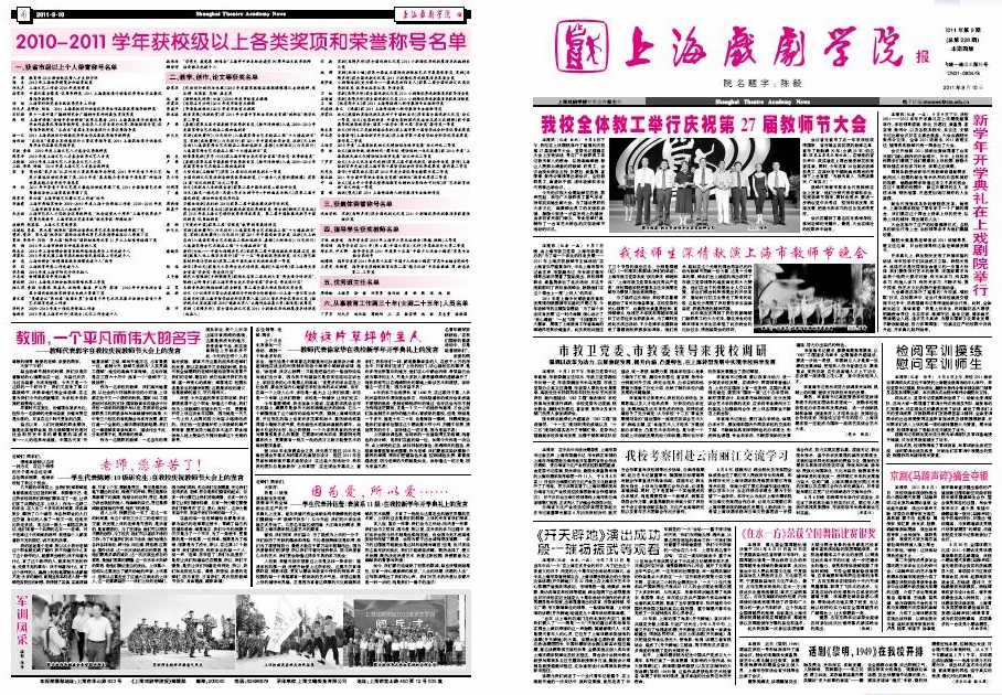 《上海戏剧学院报》2011年第9期(总第226期)已于2011年9月10日出版,本期共四版,第一、四版套红。重点内容有:《我校全体教工举行庆祝第27届教师节大会》、《我校师生深情献演上海市教师节晚会》、《新学年开学典礼在上戏剧院举行》、《市教卫党委、市教委领导来我校调研》、《检阅军训操练 慰问军训师生》等,敬请关注。也可点击下载观看。(图文、编辑/榕树)