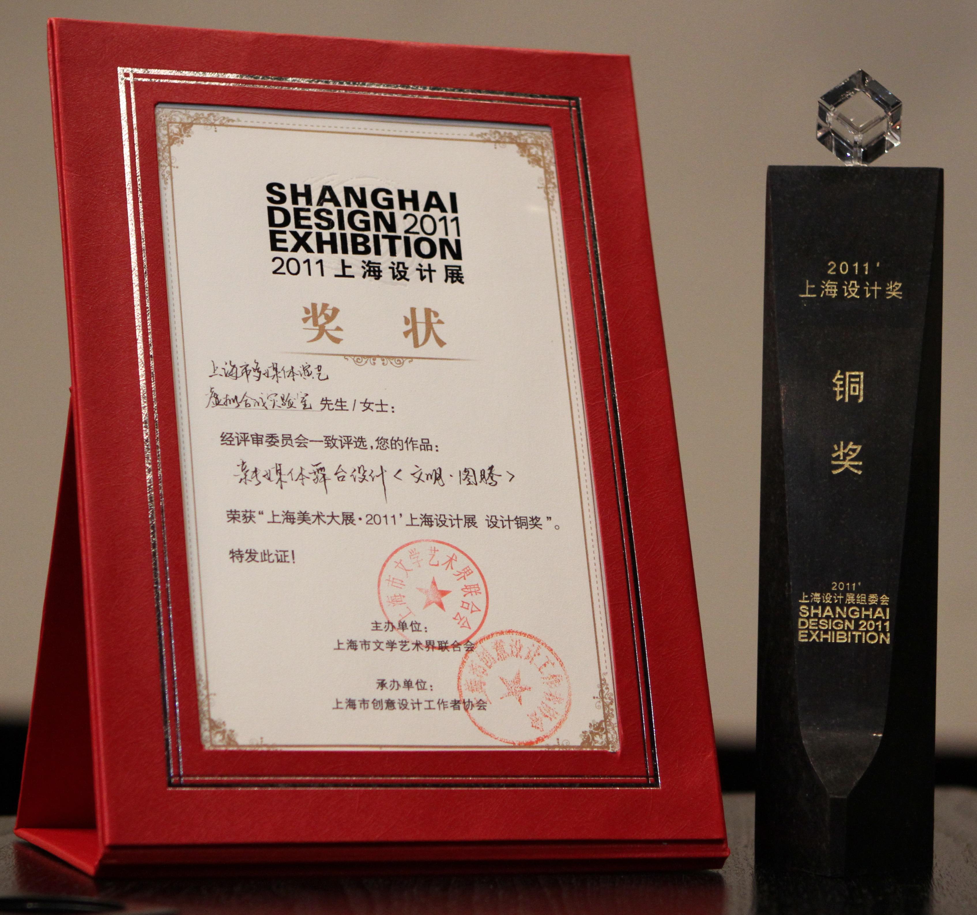 我校多媒体演艺虚拟空间合成重点实验室选送的“新媒体舞台设计《文明•图腾》”之《拓印》片段。荣获2011 上海设计展“上海设计奖”铜奖。