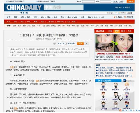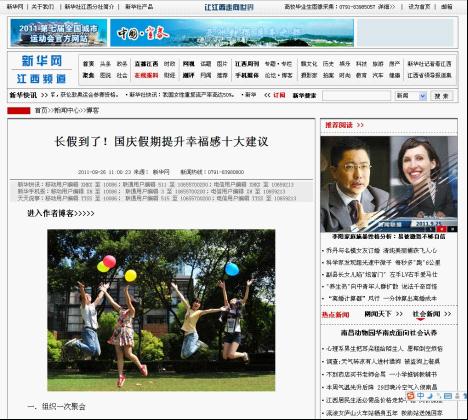 作业《国庆假期提升幸福感的十大建议》被新华网、中国日报网等媒体采用,比较理想地实践了创意幸福项目“创意,让幸福传播”的理念。幸福仍在传播!