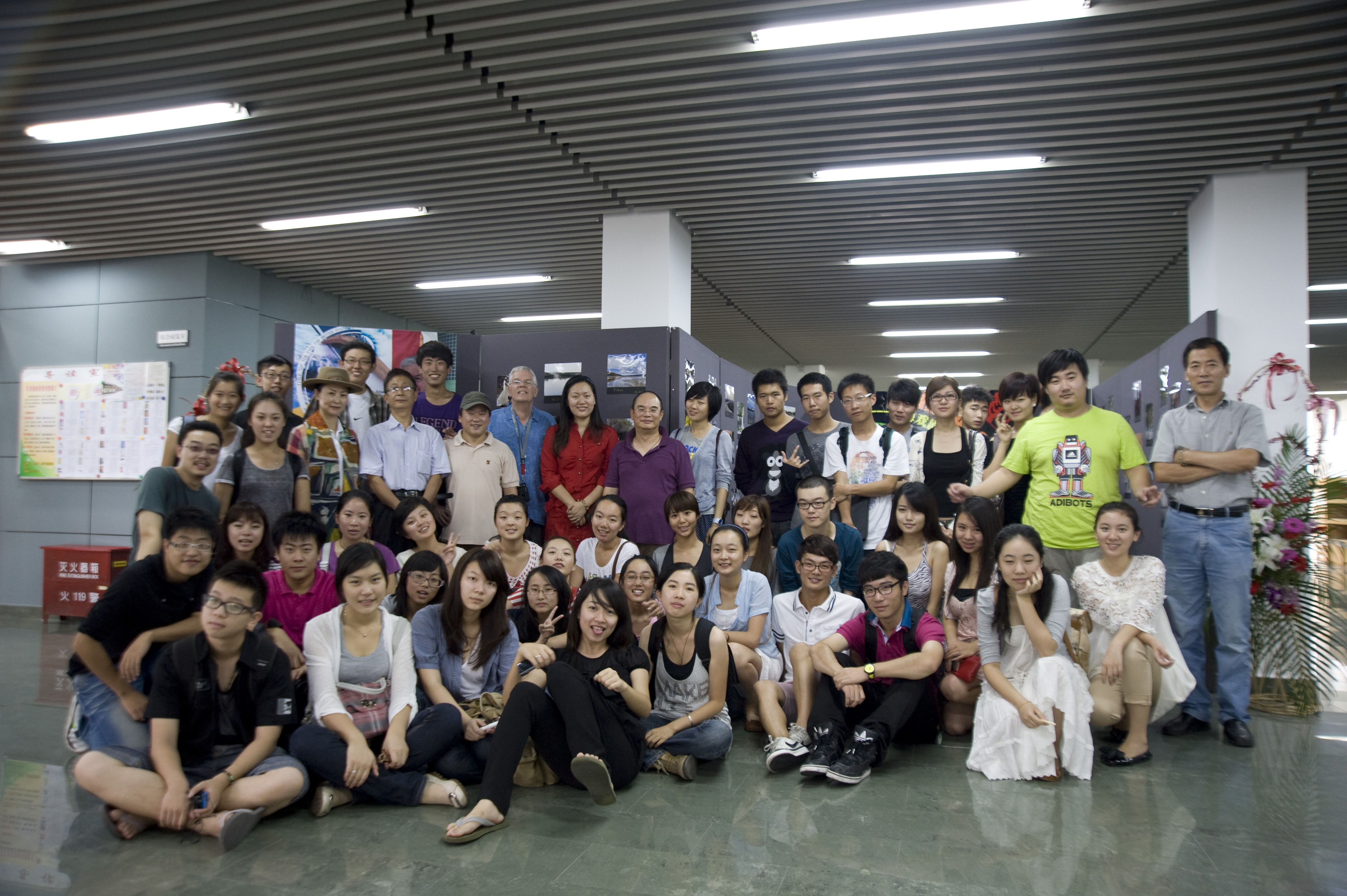 实践课程后,Mike Adams教授以其丰富的摄影知识和经验评论了各位同学在讲座后拍摄的作品,并结合包括色调、光线、明暗的处理方法以细腻的角度辅导学生在日后拍摄中更好的选择角度,这样的亲身传授令人印象深刻!与此同时,Mike Adams教授还从众多的学生作品中筛选出了47幅优秀摄影作品,并于9月29日在上海戏剧学院莲花路校区图书馆大厅拉开了影展的帷幕。此次影展由 Mike Adams教授、电视艺术学院赵韫颖院长、杨剑明老师、詹新老师、方虹老师、周凤举老师以及尹悦蓉老师等多位领导莅临参观,并与广播电视编导专业一、二年级的学生合影留念。在学生的簇拥下,Mike Adams教授等各位老师、同学先后在影展的签名板上留下了观影感受和签名,气氛极其热烈!