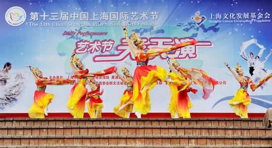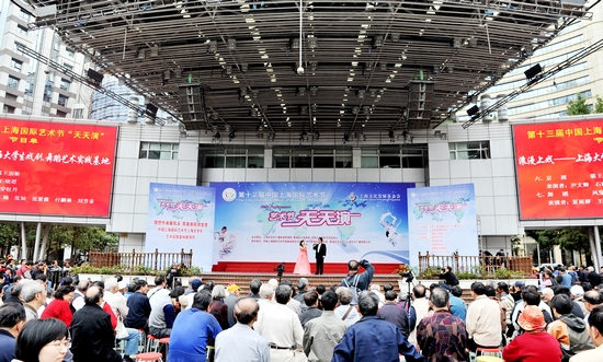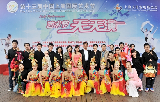 由上海市教卫党委、市教委主办的第十三届中国上海国际艺术节上海大学生艺术实践基地展演周活动日前在南京路步行街世纪广场举行。昨日,我校倾情献演天天演舞台,举办“浪漫上戏”专场演出。上海国际艺术节组委会群文部主任赵崇琦、上海市教卫党委宣传处副处长劳晓芸等领导在我校宣传部部长张生泉陪同下出席观看了演出并在演出结束后上台与我校师生合影。