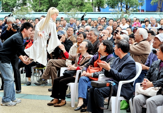 图为我校的木偶节目与观众互动