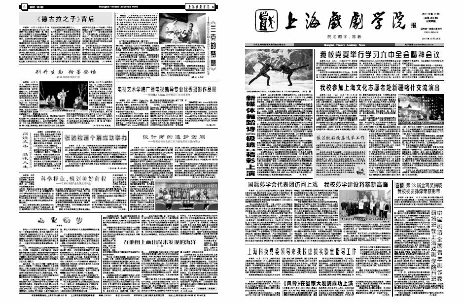《上海戏剧学院报》2011年第11期(总第228期)已于2011年10月30日出版,本期共四版,重点内容有:《我校党委举行学习六中全会精神会议》、《新媒体舞蹈诗<极境>精彩上演》、《我校参加上海文化志愿者赴新疆喀什交流演出》、《国际莎学会代表团访问上戏 我校莎学建设将攀新高峰》等,敬请关注。也可点击下载观看。(图文、编辑/榕树)