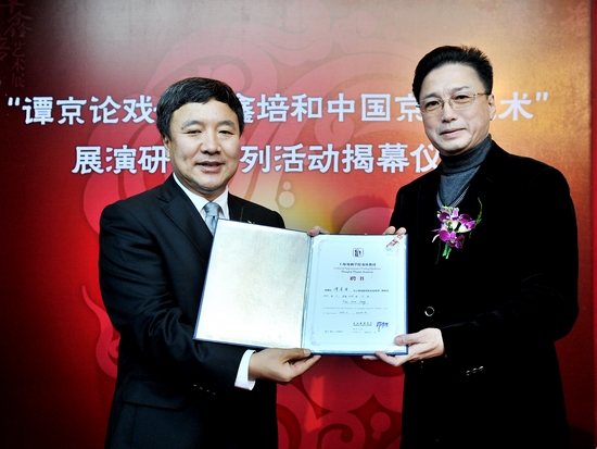 图为韩生院长向谭孝曾颁发上海戏剧学院客座教授聘任证书