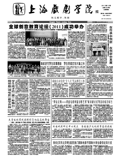 《上海戏剧学院报》2011年第13期(总第230期)已于2011年12月20日出版,本期共四版,重点内容有:《全球创意教育论坛(2011)成功举办——“联合国贸易与发展会议创意经济学术交流网络”中国联络总部落户我校》、《在传承中创新 在创新中发展——<以镜照镜>首发式暨学术研讨会顺利举行》、《我校进行学生年度表彰 学生获奖比例大幅上升》、《网络剧(微电影)教学开辟学生成才的“第三种舞台”》等,敬请关注。也可点击下载观看。(图文、编辑/榕树)