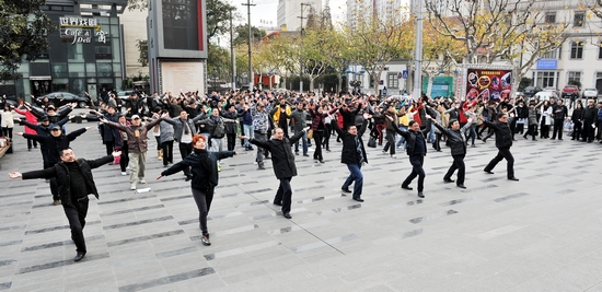 图为全体教职工做广播体操热身