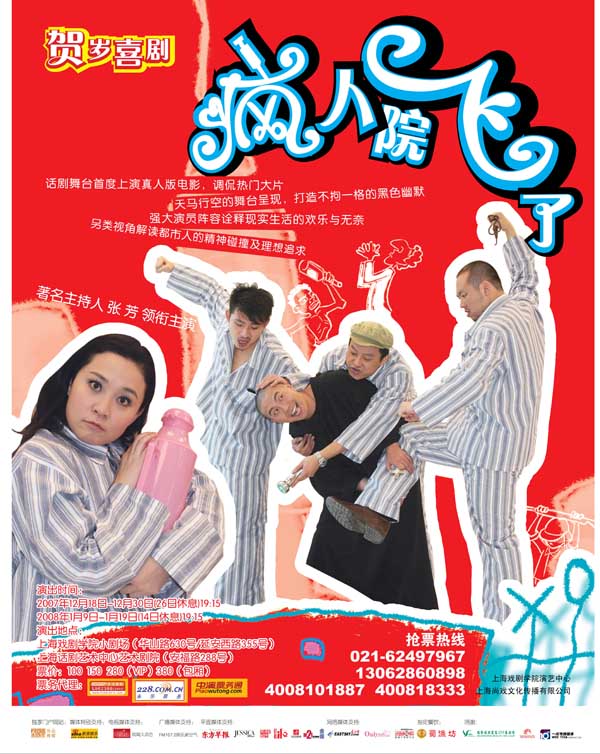由SMG当红主持人张芳和上海戏剧学院“新生代”主力军领先主演的贺岁话剧《疯人院飞了》讲述了疯人院里的一群被社会抛弃的可怜人的故事。“将军”、“和尚”、“疯女人”和“呆子”,他们由于各种原因被束缚在这个特殊的空间里,可是他们却对自由充满了向往。这样一群完全被隔离于现实世界的精神病人为了自由,不断与年轻的医生和漂亮的护士斗智斗勇,而在他们看来,追求自由的最大障碍就是医院里的那堵厚厚的墙。