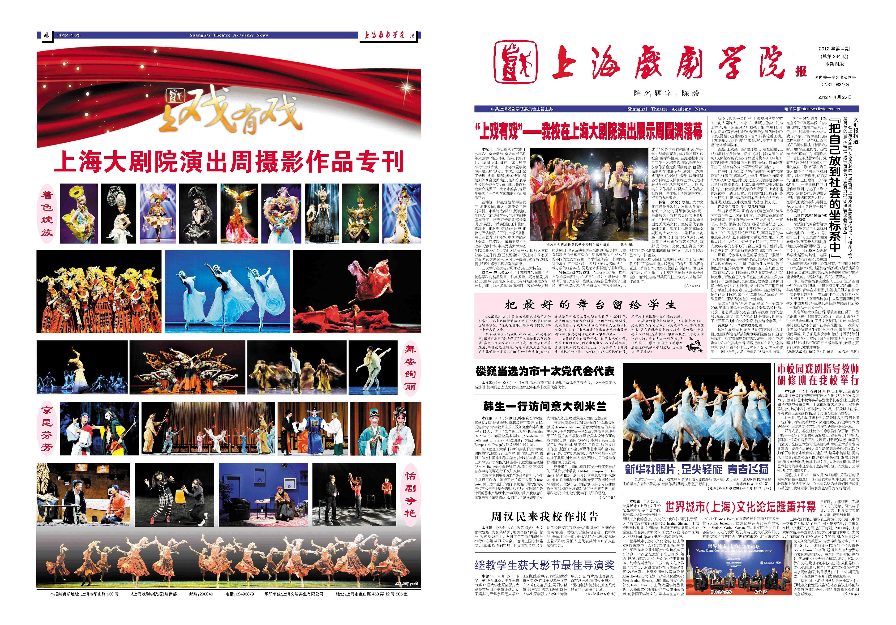 《上海戏剧学院报》2012年第4期(总第234期)已于2012年4月25日出版,本期彩版,共四版。重点内容有:《“上戏有戏”——我校在上海大剧院演出展示周圆满落幕》、《楼巍当选为市十次党代会代表》、《韩生一行访问意大利米兰》、《世界城市(上海)文化论坛隆重开幕》、《市校园戏剧指导教师研修班在我校举行》等,敬请关注。也可点击下载观看。