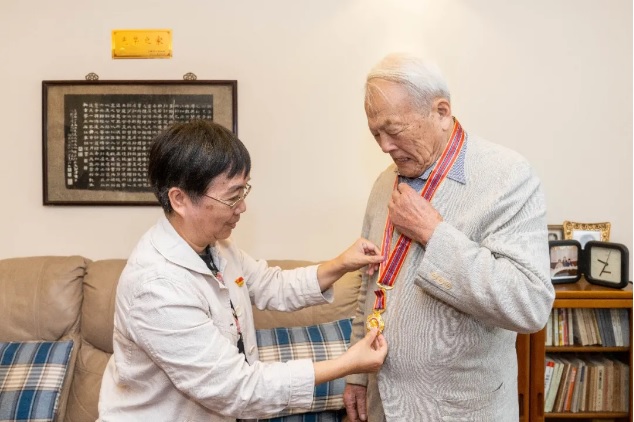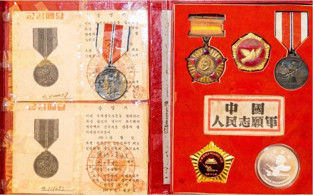 周培松老师激动地接过上戏老师们带去的由中共中央、国务院、中央军委向参加抗美援朝出国作战的、健在的志愿军老战士老同志颁发的“中国人民志愿军抗美援朝出国作战70周年”纪念章,并庄重地佩戴在胸前。与此同时,周培松老师还取出了一直珍藏的以往所获得的奖章、纪念章等,那段峥嵘岁月从来都没有在他的记忆中远去。