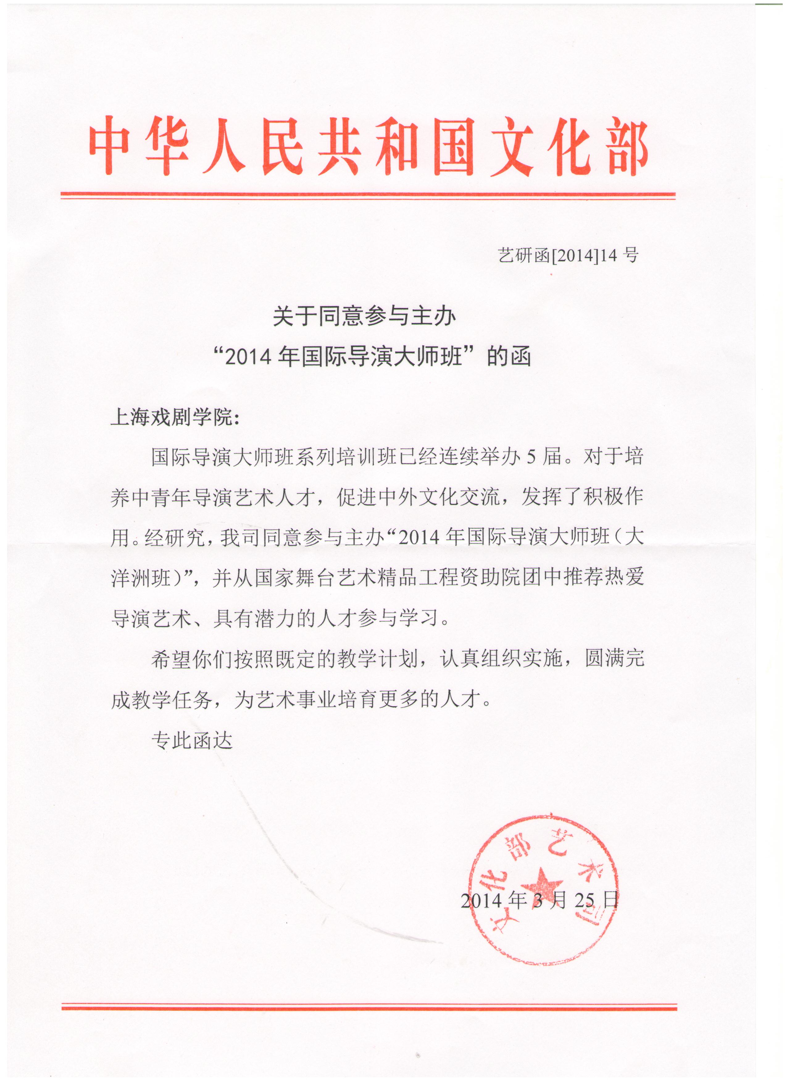 The 2014 International Master Class on Directing will be held on 12th.May to 15th Jun., 2014. Cosponsored by the Art Bureau of the Chinese Ministry of Culture and Shanghai Theatre Academy, this event is hosted by Directing Department of STA. Five internationally famous directors from Oceania (including Australia and New Zealand )will be invited to give lectures and workshops. Each International director will teach for a week. During the first fours days of the week, the master directors will give lectures and train the students on class. On the fifth day, the students are required to give a presentation in public. The professors and students will sum up and review what they have taught and learned in the whole week by discussing in the last two days.