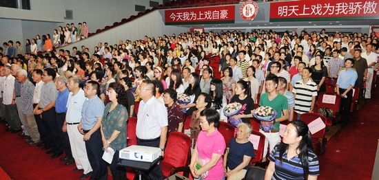 大会现场鲜花怒放、歌声四起,我校广大教职员工喜气洋洋、神采奕奕。首先全体起立,奏国歌。黄昌勇副院长宣布了近一年来我校获得国家、省市等各类奖项的教师名单,郭宇副院长宣布了教龄满30年(女满25年)的名单。在嘹亮的音乐声中,获奖者走上舞台接受荣誉证书。随后,学生代表向今年的退休教职员工献花。