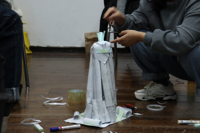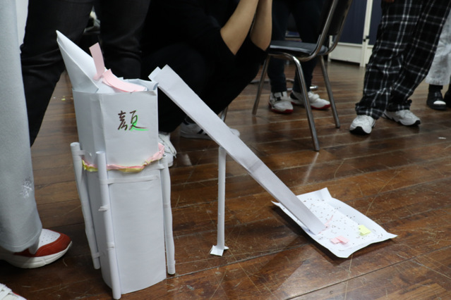 队长带领队员们共同完成“建筑创作”,面对几张海报白纸,简易的材料和较短的时间,同学们并没有退缩。无论是“颜队”的“滑梯城堡”还是“四区兄弟队”以火锅为原型的“鼎”的创作都令人眼前一亮,“城堡”充满童心与美好向往,类似牛肉的摆盘的“鼎”不仅象征食物美,更有“众人拾柴火焰高”的精神内涵。