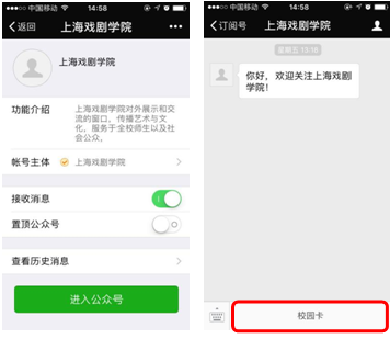 1.关注“上海戏剧学院公众号”首页下方点击“校园卡”功能