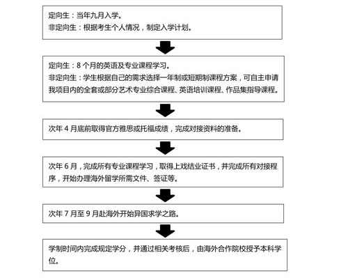 面向全国招生(包括港澳台地区、外籍),同时也欢迎零艺术基础的高中生及中专艺术类学生报考。出国学习前需取得高中(或同等学历)毕业证,以及提供高中毕业成绩单。