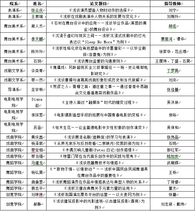根据《上海戏剧学院本科毕业论文(毕业创作总结)工作管理条例》,经院系推荐和专家评审,表演系张云庆《浅谈演员塑造人物时动作的选择》等22篇论文被评为2017届本科优秀毕业论文,具体名单如下: