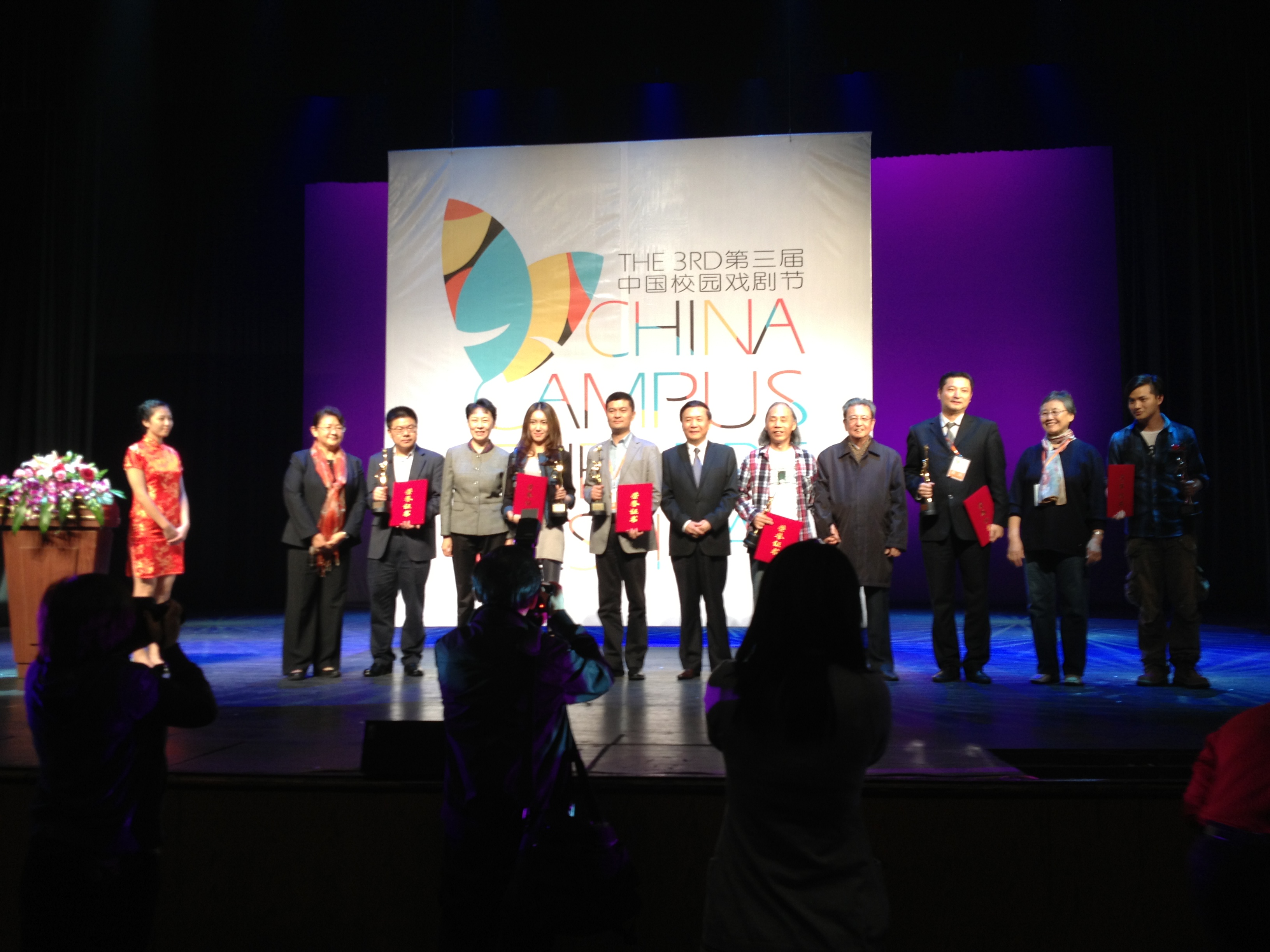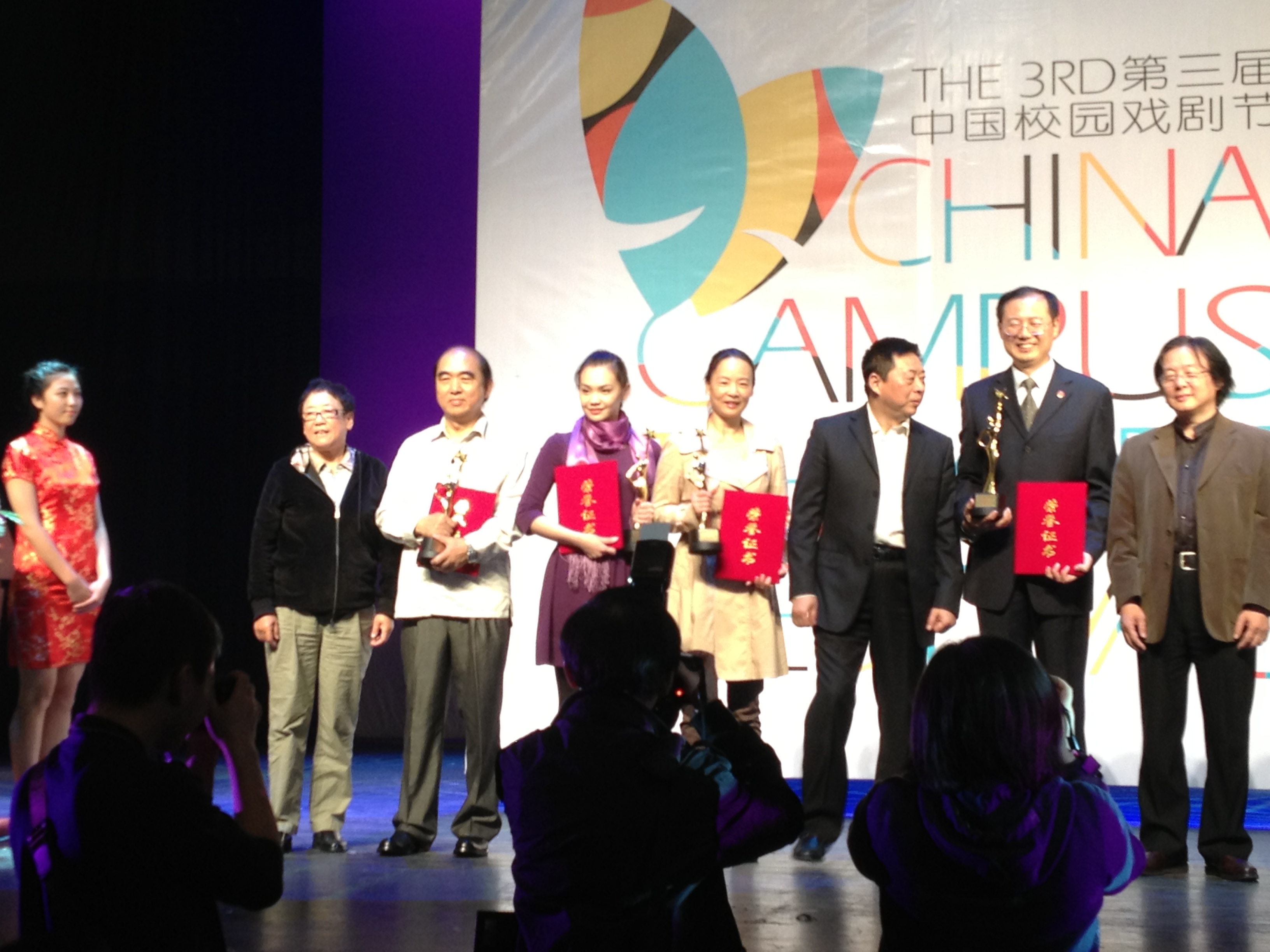 10月27日晚,“魅力校园·青春飞扬”第三届中国校园戏剧节在上海话剧中心圆满闭幕。中国剧协分党组书记、驻会副主席季国平,中共上海市委宣传部副部长陈东,中国剧协分党组副书记、秘书长刘卫红,市教卫党委副书记、教委副主任高德毅,著名艺术家焦晃等出席颁奖典礼,并分别为获奖团队及个人颁发“中国戏剧奖·校园戏剧奖”各大奖项。我校副院长黄昌勇、宣传部长张生泉、《国家的孩子》编剧孙祖平等出席并观看了闭幕大戏《资本·论》。