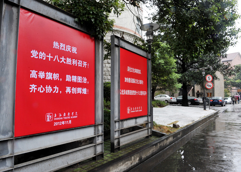 11月8日,上海戏剧学院校内彩旗飘展,喜庆十八大标语在校园中格外醒目,广大师生员工怀着喜悦的心情开展各种形式的活动,迎接和庆祝党的十八大胜利召开。