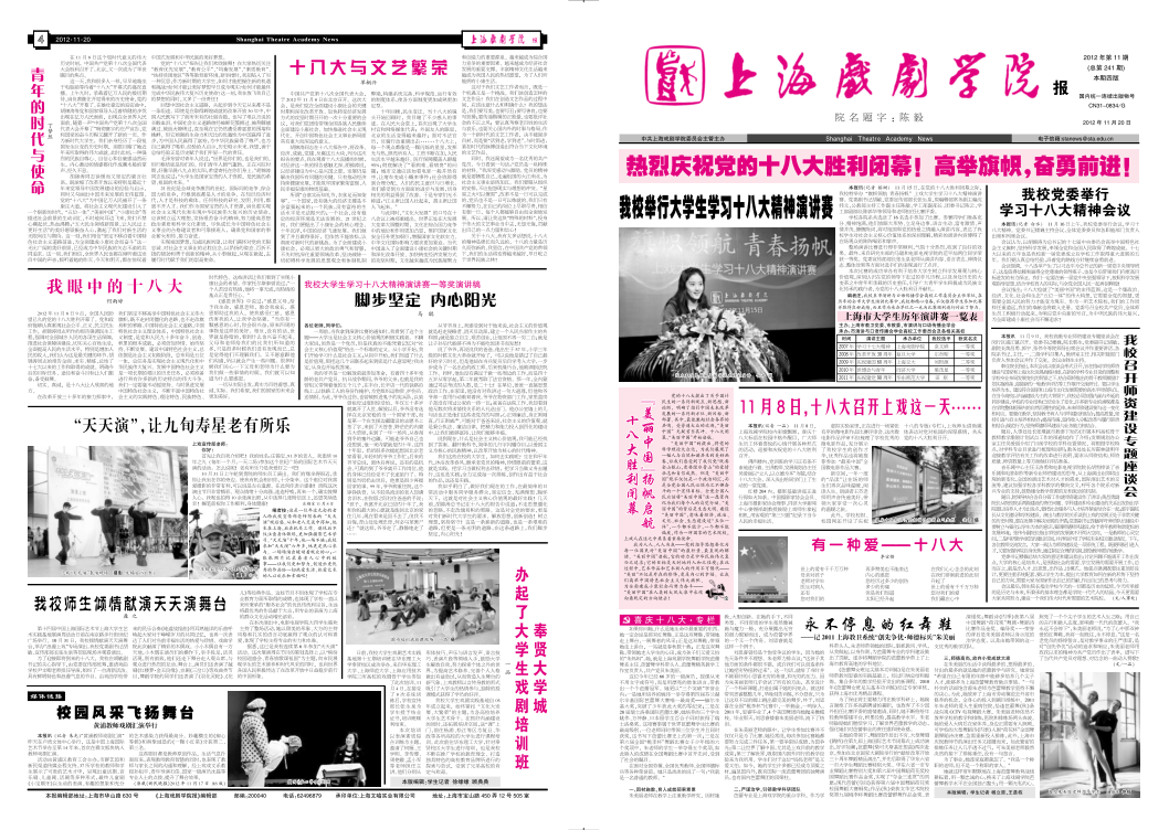 《上海戏剧学院报》2012年第11期(总第241期)已于2012年11月20日出版,本期套红,共四版。重点内容有:《我校举行大学生学习十八大精神演讲赛》、《我校党委举行学习十八大精神会议》、《11月8日,十八大召开上戏这一天……》等,敬请关注。也可点击下载观看。(文、图、编辑:榕树)