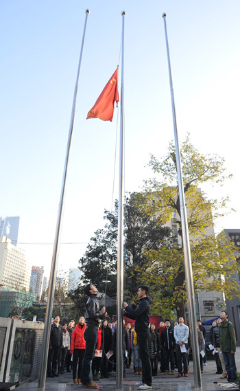 12月6日早上7点,迎着朝阳,上戏各院系学生党员代表集合在上戏剧院广场,以饱满的热情参加上戏升旗主题教育活动的启动仪式。此次升旗教育主题活动是由上海戏剧学院学生党总支学习贯彻十八大精神系列活动之一,以“凝聚在国旗下,感悟在升旗中”为主题,旨在将爱国主义精神具象化、爱国主义教育仪式化、爱国行为日常化,是上戏对思政教育有效性的新探索。学工部部长徐咏,副部长、团委书记陈云,副部长、学生党总支书记陈郭华等老师一同参加了此次启动仪式。