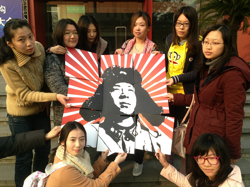 随后,两位刚成为预备党员,来自于11级艺术设计专业的毛翘楚与王任伟同学从创意学院学生党支部书记亓季松老师手中接过国旗,成为了光荣的上戏升旗手。伴随着国歌雄壮的音乐,鲜艳的五星红旗冉冉升起,在朝日的映衬下熠熠生辉。升旗后,9名学生代表分别抽取了一张正反印有图案与文字的正方形卡片。同学们将9张卡片按一定的顺序摆放后,正面就呈现出了一幅巨大的雷锋像,反面则是从学生中广泛征集来的与雷锋有关的9个主题词:“新媒体”、“时尚”、“表演”、“给力”、“感恩”、“无私”、“达人”、“榜样”、“正能量”。接着,代表们围绕着自己抽取到的主题词,结合时代对雷锋与雷锋精神展开了讨论,并与在场的同学一同分享了感悟。有代表抽到了“表演”,她表示:纪念雷锋不应该过于追逐表面形式,更不能只有在3月5日才学习雷锋,上演“雷锋叔叔三月来四月走”的闹剧;任何做作的学雷锋活动,更像是一场精心策划的表演,而参与者则活脱脱是一名演技或优或劣的演员。另一位抽到“时尚”的同学表示:雷锋精神不仅对于当下仍旧具有重要的激励意义,在今后也将如此;纪念与缅怀雷锋的同时,更需要将雷锋精神发扬光大,让积极实践雷锋精神成为这个时代永远的时尚。最后,亓季松老师总结道:历史与现实证明,雷锋无论是他那个时代还是这个时代或是将来哪个时代,他都无愧于一名英雄榜样,一名具有时代意义、传递着无限正能量的给力达人。而雷锋精神所体现的无私奉献更应当作为一种人类的普世价值被我们代代相传,积极实践。
