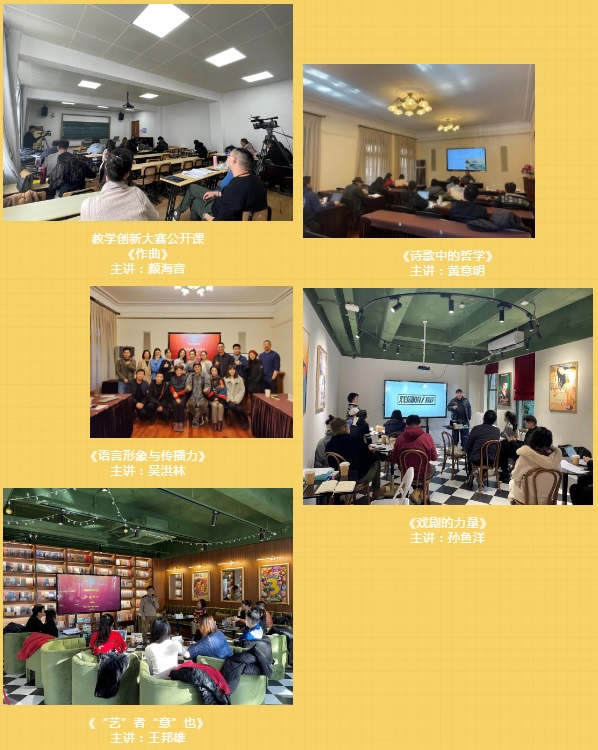 以观摩李旻原老师的教学创新大赛公开课《东西方跨文化剧场》为开场,先后聆听《诗歌中的哲学》《作曲》《语言形象与传播力》《“艺”者“意”也》《戏剧的力量》等多门精彩的专业课。