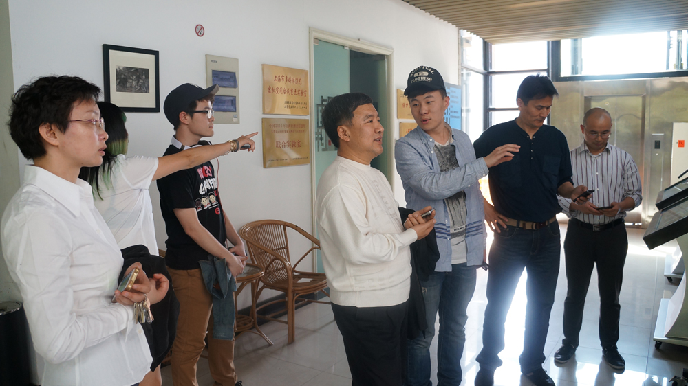 图为领导和老师在参观毕业展,用微信二维码在查看作品内容和学生资料