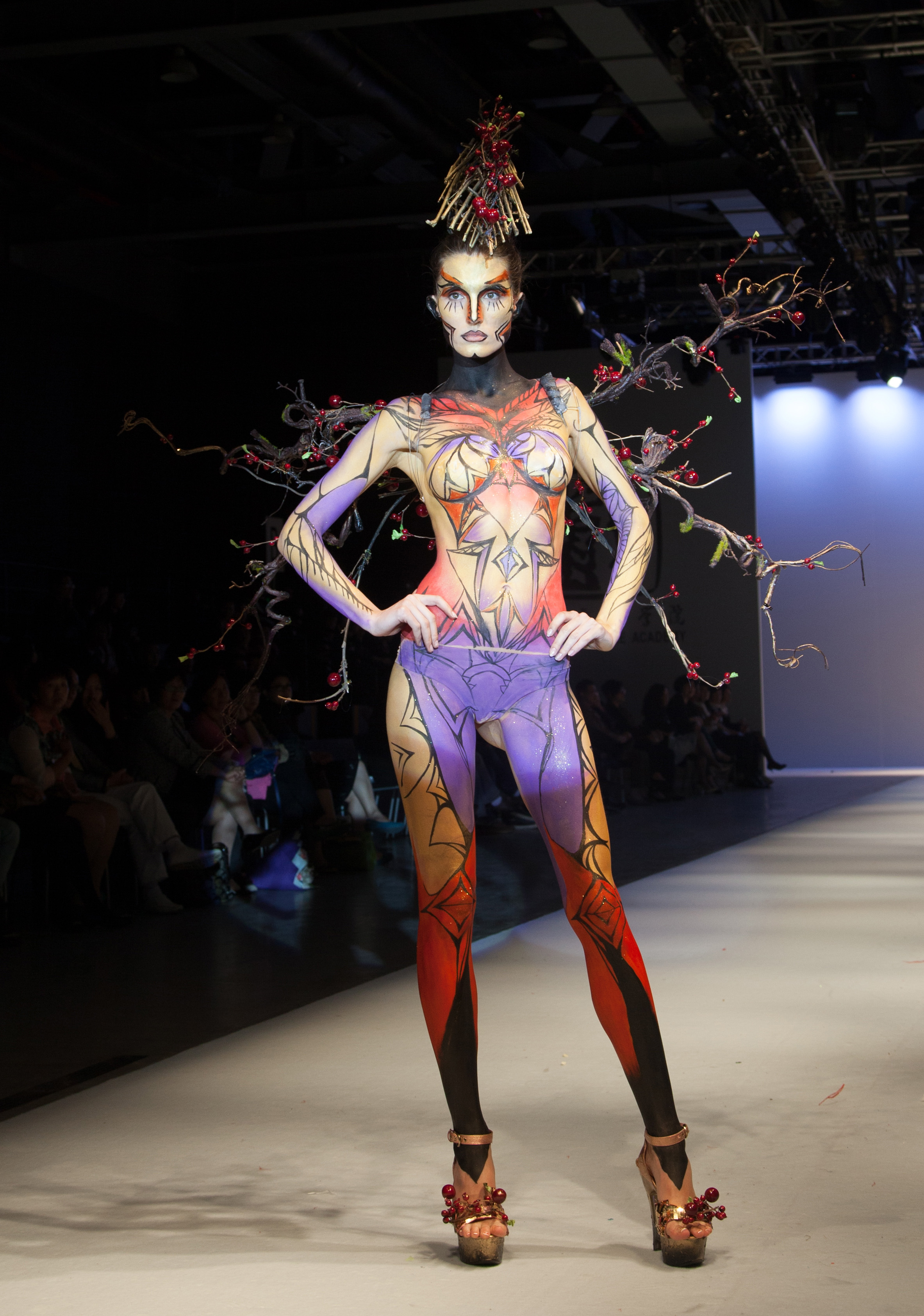 今年“着色”的主题不同于往年,总负责人舞美系服化教研室主任、人物造型领域的专家徐家华老师将其命名为“四季恋歌”。无论是温暖的春、热情的夏、丰收的秋还是唯美的冬,在聚光灯照亮T台的那一刻,所有的一切都被赋予了生机与活力,从自然界寻找一种原始的情感,与人和谐相处,用自己独特的视角探索并创造出最纯真的感动。即使再令人眼花缭乱的缤纷色彩,只要集合为一件集天地灵气而成的服饰上,用模特的婀娜身姿就能展现出一种惊人的流动的美。尤其是演出的最后一阶段,几名外国模特展示的由09级服化毕业班设计的蝴蝶、海马、鱼、果树、珊瑚、雪花等人体彩绘更是体现了与大自然合为一体的感觉。