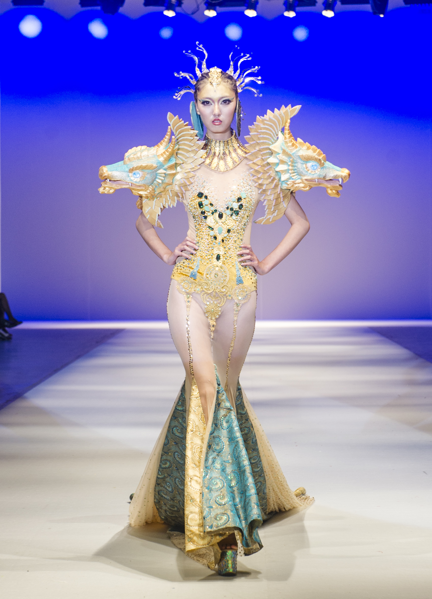 09级的赵子荷以及10级的李萌璐分别用青铜色的圆形头饰双肩搭配龙头的金色修身以及白色�有红色花饰搭配红色拖地水袖的长裙引来了很多观众的目光,中华民族古典而优雅的女性魅力深深折服了大家。