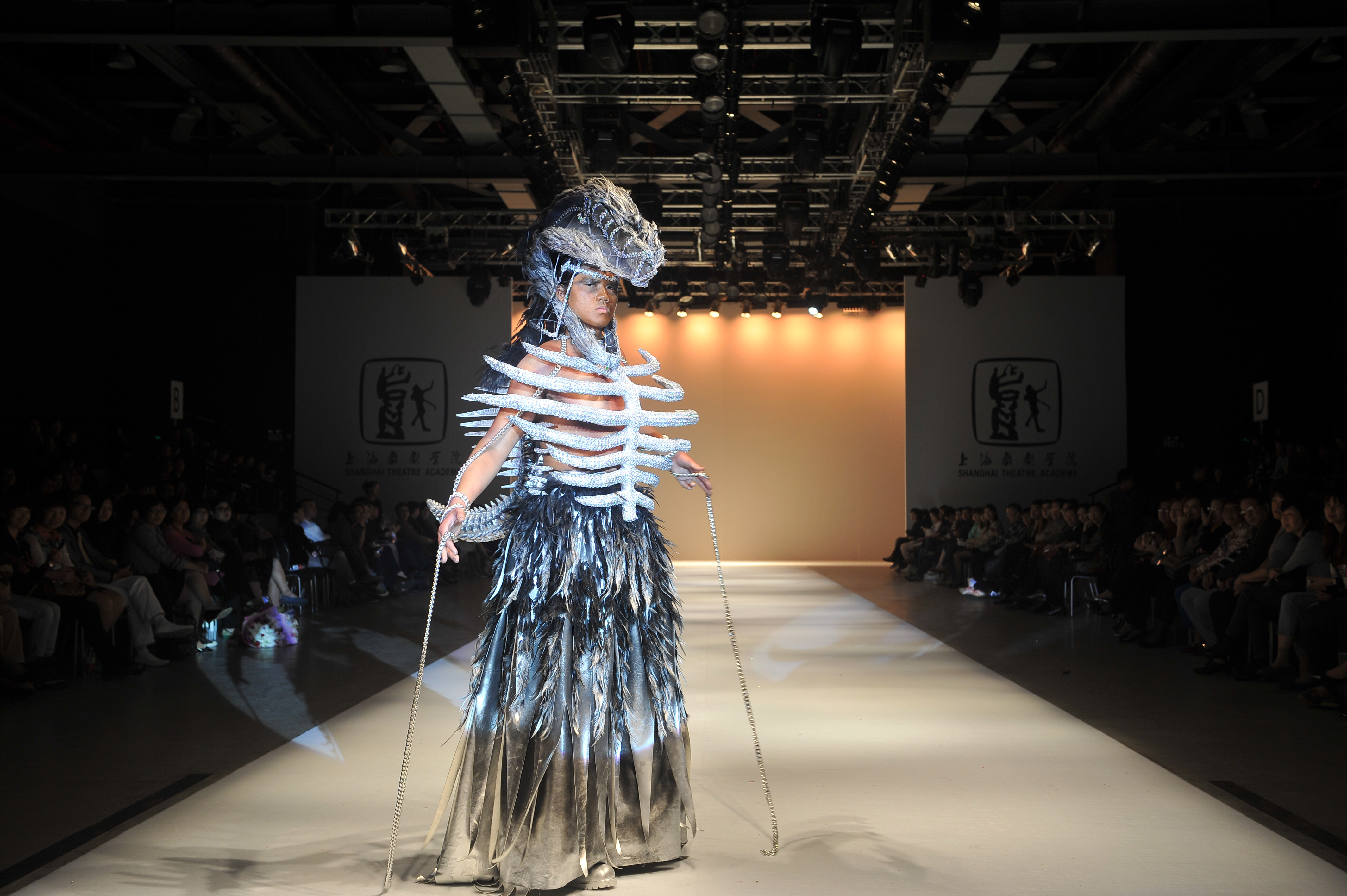 今年男性模特的造型突出了男人所特有的一种野性奔放的魅力,给人留下深刻印象。11级的傅轶玮所设计的一套造型更是将其发挥到极致。头戴和身穿龙骨,臂绕铁链下着铁色沾满羽毛的遮脚半身裙及黝黑的皮肤,从这些特点中体现出了力量和强大的气场。