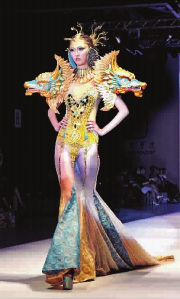 服饰中大胆的色彩运用、迷人流畅的线条、创新的细节设计,凸显了美好的青春年华。而在人体妆绘中,耀眼的彩蝶展翅飞舞、红色的海马头冠配上蓝色海藻身体,令人舒展遐想。舞台上,模特的演绎犹如四季在流动变化,其中赵子荷的作品《蛟螭》,曾获得“盛虹杯”中国纤维创意空间作品联展金奖。