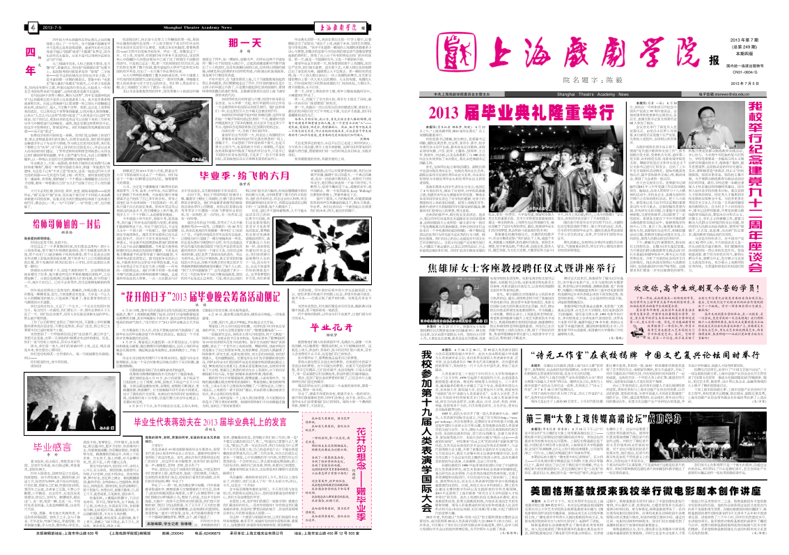 《上海戏剧学院报》2013年第7期(总第249期)已于2013年7月5日出版,本期套红,共四版。重点内容有:《2013届毕业典礼隆重举行》、《我校举行庆祝建党九十二周年座谈会》、《焦雄屏女士客座教授聘任仪式暨讲座举行》、《我校参加第十九届人类表演学国际大会》等,本期第三版还刊登了《陈明正谈艺术教育的理念》,敬请关注,也可点击下载观看。(文、图、编辑:榕树)