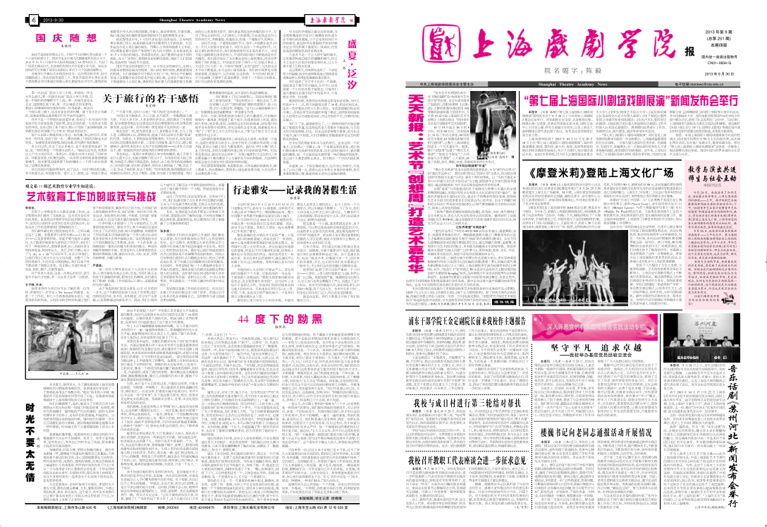 《上海戏剧学院报》2013年第9期(总第251期)已于2013年9月30日出版,本期套红,共四版。重点内容有:《艺术节“创想周”打造艺术嘉年华》、《“第七届上海国际小剧场戏剧展演”新闻发布会举行》、《<摩登米莉>登陆上海文化广场》、《浦东干部学院王金定副院长前来我校作主题报告》等,本期第三版还刊登了《深入开展党的群众路线教育实践活动主题学习会发言摘要》,敬请关注,也可点击下载阅读。(文、图、编辑:榕树)